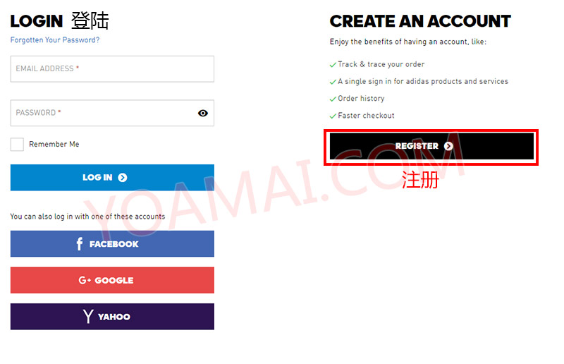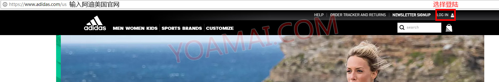 第二步:打开ADIDAS官网以后,点击右上角的“Log In”进行登陆或者注册。如下图