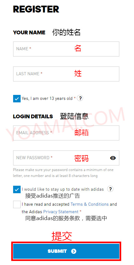第四步:输入先前准备的邮箱(做为adidas官网的登陆账户),再输入登陆密码,姓名等等信息,确认无误后点击“SUBMIT”进行提交。如下图