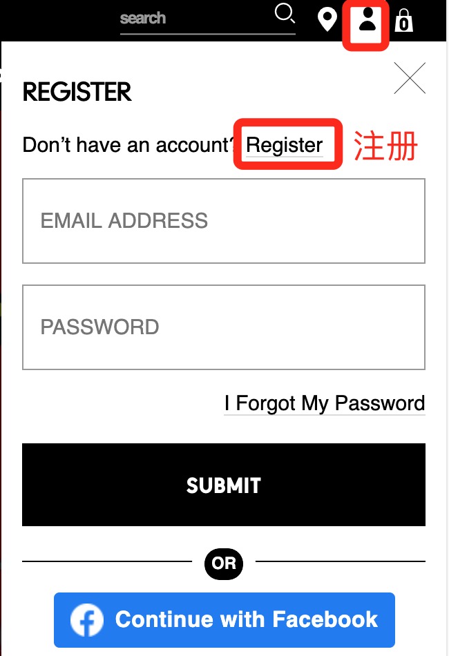 第二步:打开网站后直接就是美国区的魅可官网,鼠标移到右上人头图标,点击会弹出登录框,在登录框中点击Register。如下图: