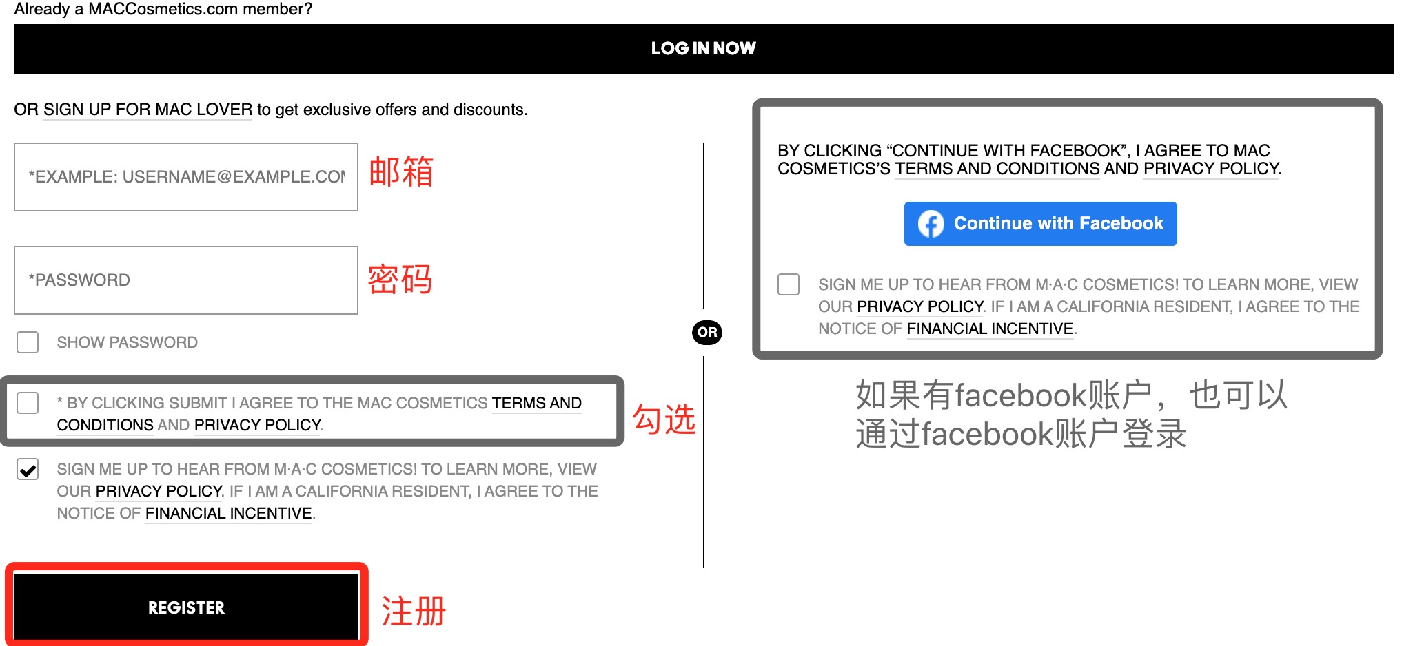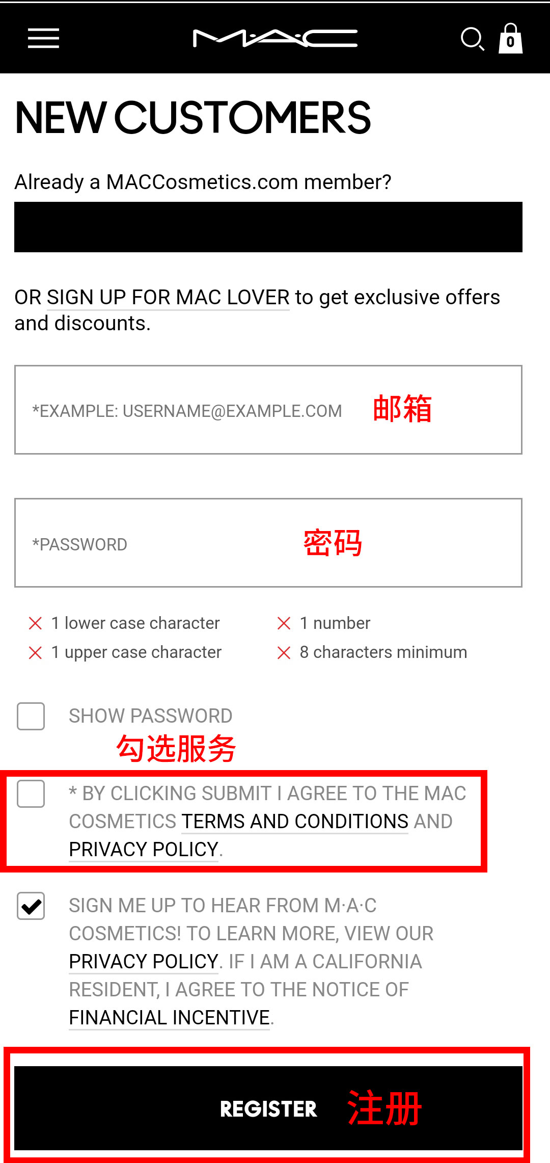 第三步:进入注册页面后,输入邮箱和密码,勾选mac服务条款点击REGISTER即可注册,如下图: