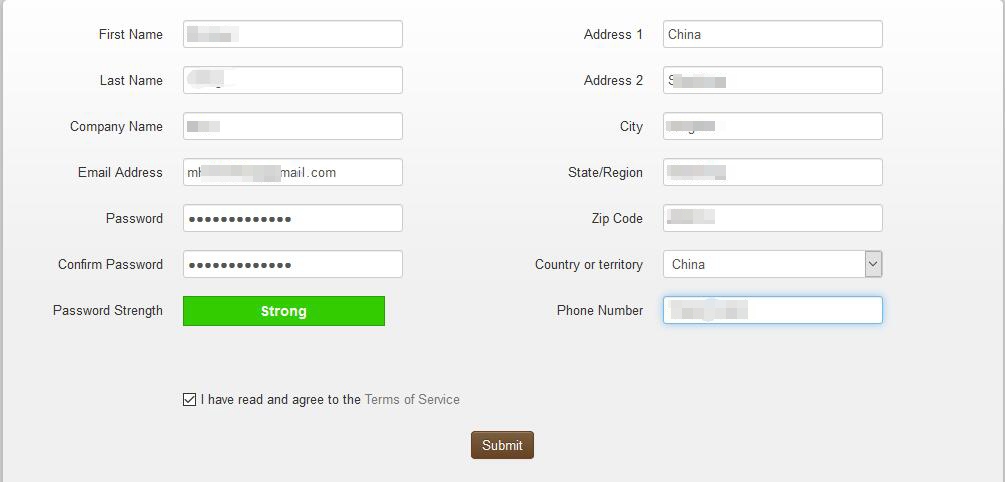 第三步:填写完注册信息(除邮箱外,地址什么的可以随便写),勾选底部的“I have read and agree to the Terms of Service”,最后点击“Submit”按钮,注册后默认登录成功,接下来就可以选择你的VPS方案了。