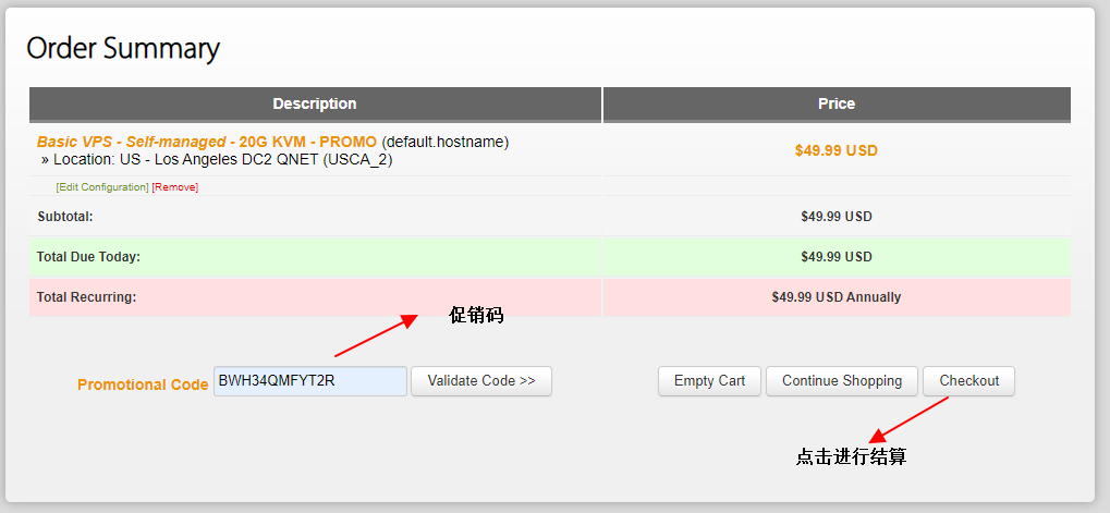 在上图中的“Promotional Code”,输入优惠码BWH34QMFYT2R,并点击右侧验证按钮“Validate Code”,最后点击“Checkout”进行结算。