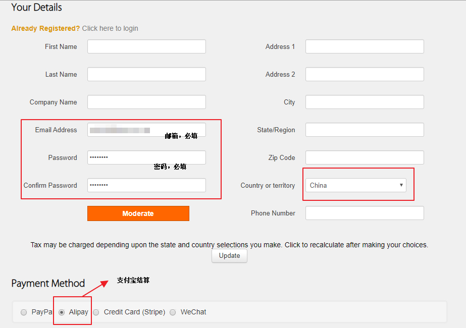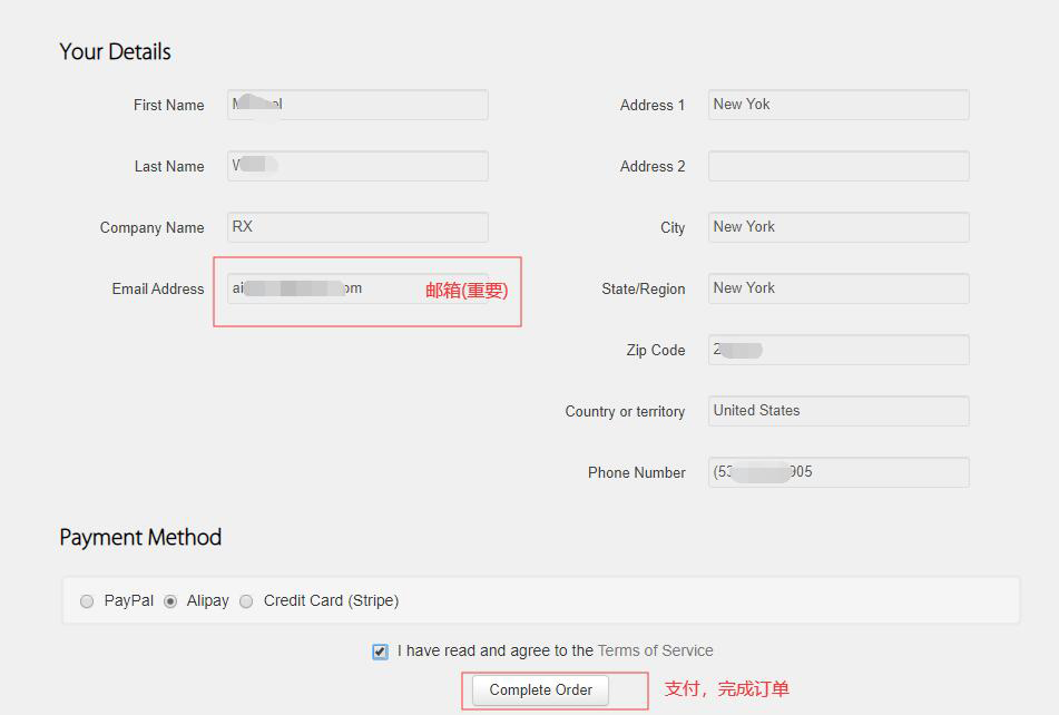 2、尚未注册 如果你前面没有进行注册,则会让你填写个人信息进行注册,然后才能选择结算方式,最后点击”Complete Order”进行付款: