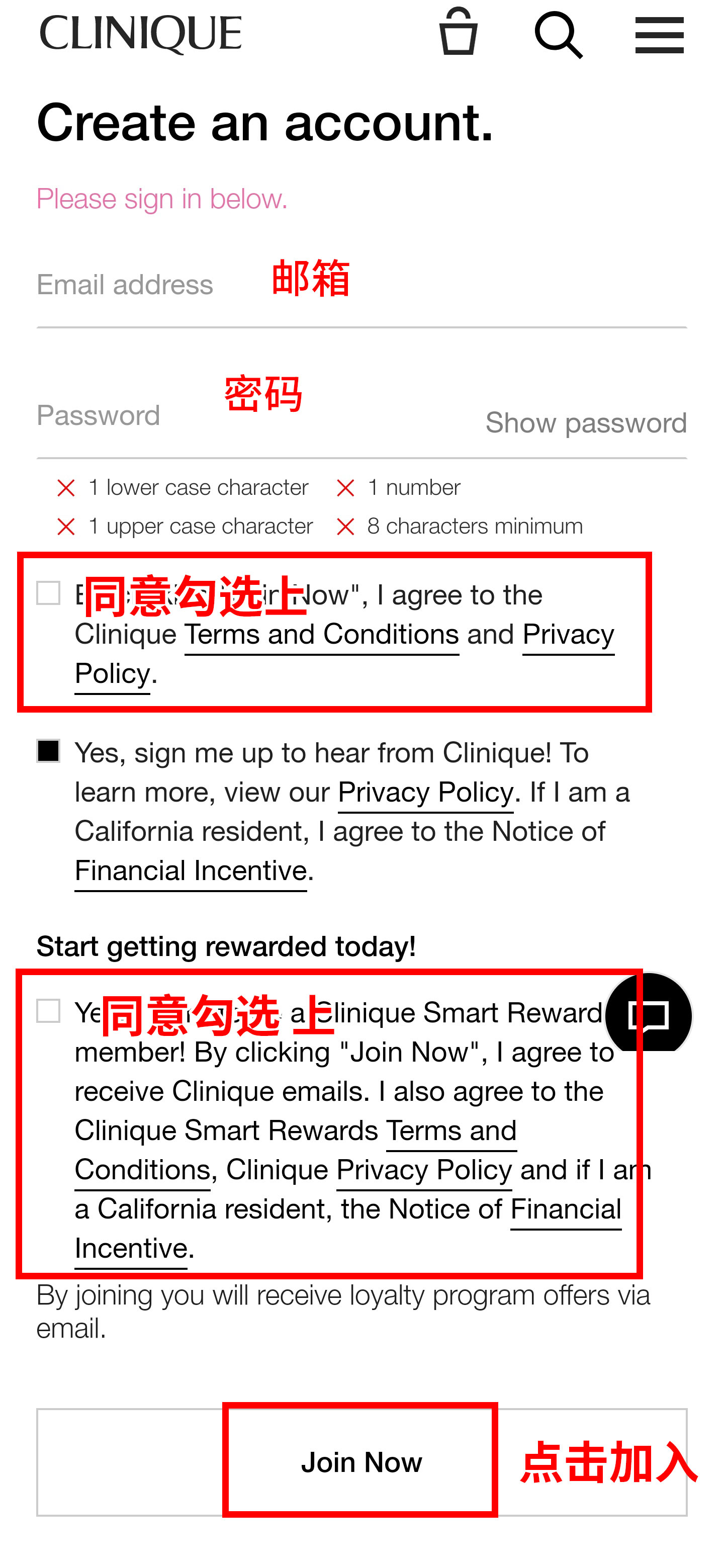 第五步:在注册页面,填写上自己的邮箱,倩碧的密码(不等同于邮箱密码),勾选上相应的服务条款,最后点击Join Now进行注册,如下图: