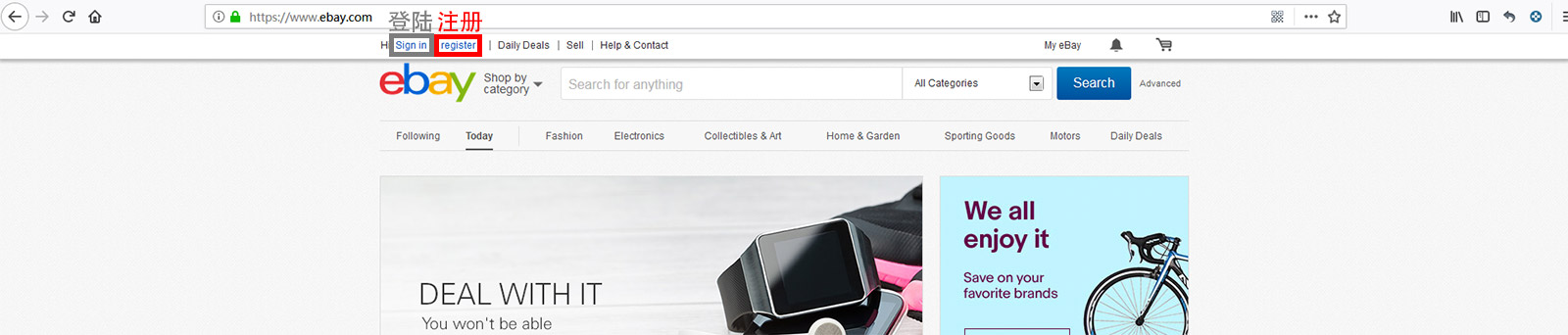 第一步:打开浏览器(IE、谷歌浏览器、火狐浏览器等等)输入www.ebay.com或者直接点击这里>,点击“register”进入注册界面,如下图