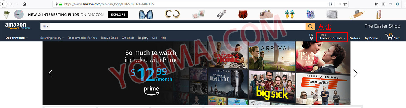第二步:打开亚马逊后,点击可上角"Hello XXX"(没有账号?点这里),进入个人账户信息界面,如下图