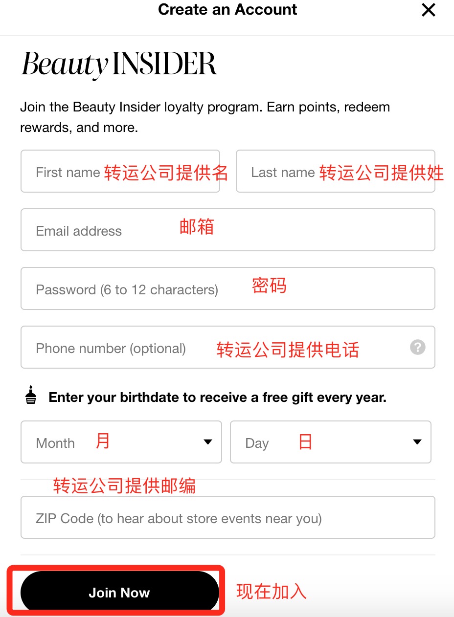 第四步:在注册页面请填写正确的信息,这些信息可以是你注册的转运公司提供的信息,然后再点击Join Now按钮进行提交。如下图: